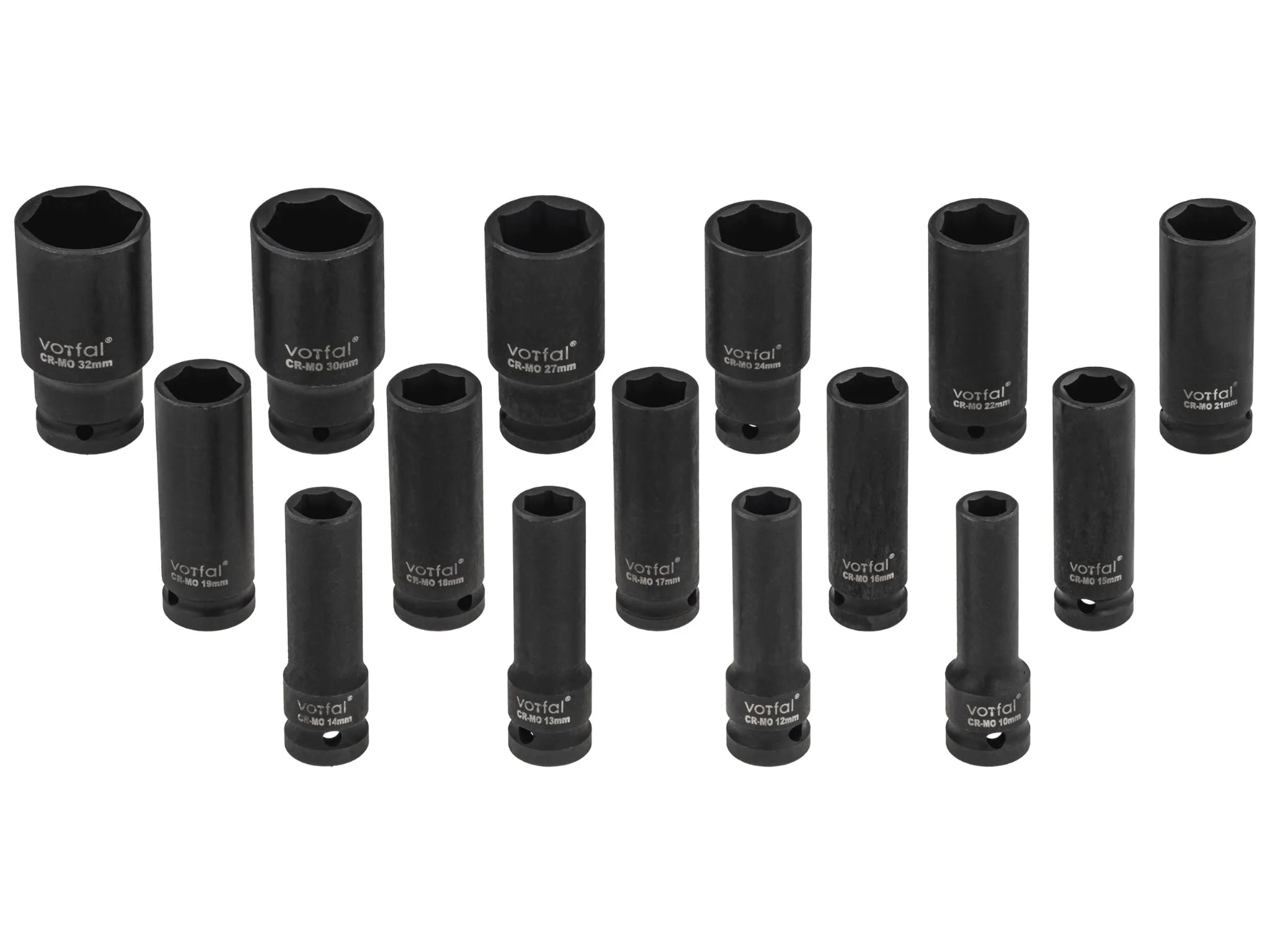 - W zestawie klucze nasadowe w rozmiarach: 10, 12, 13, 14, 15, 16, 17, 18, 19, 21, 22, 24, 27, 30, 32 mm