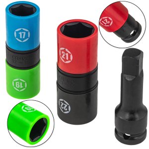 Idealny do odkręcania śrub kół, zawieszenia i elementów podwozia. Kompaktowa konstrukcja zapewnia wygodę i oszczędność miejsca – dwa rozmiary w jednej nasadce!
